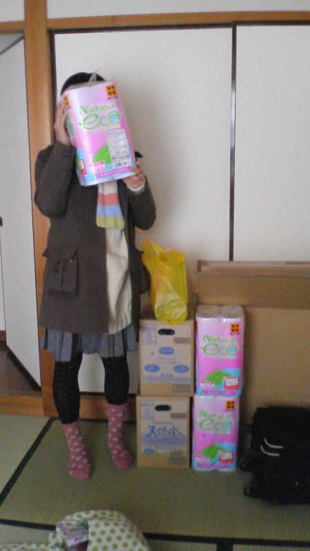 今日は仮設トイレ用のトイレットペーパーや掃除用具等の買い出し作業を行いました。